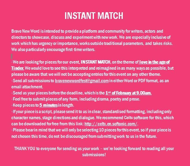 They’re looking for 5-minute scratch pieces of new writing//drama//prose//poetry on the theme of ‘love in the age of Tinder’ to be submitted by 9am on the 1st of Feburary and sent as an attachment to bravenewwordfest@gmail.com.